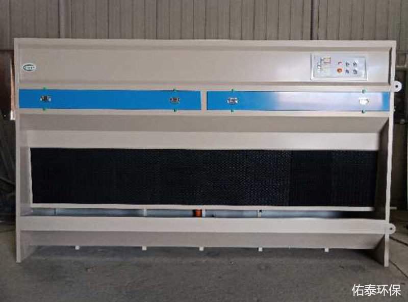 L5.0*W0.9*H2.1(m),面板1.0厚鍍鋅板噴塑,水池1.5mm鍍鋅板噴塑。水簾201不銹鋼。一層噴淋,一層浮球。電控箱一個。水泵一個,風機4臺。