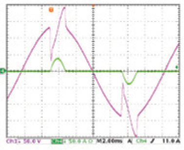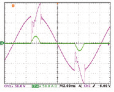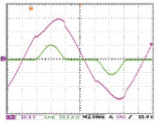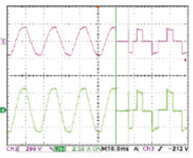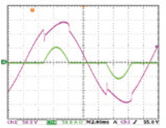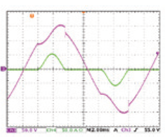 圖2為橋式整流的典型線路。在RLC模式下,用戶可透過設定RLC值,100%模擬實際待測物的行為。圖3&4分別是透過實際被動負載(電阻、電感、電容)與使用RLC負載模式量測。圖5則為定電流模式下所得到的波形。