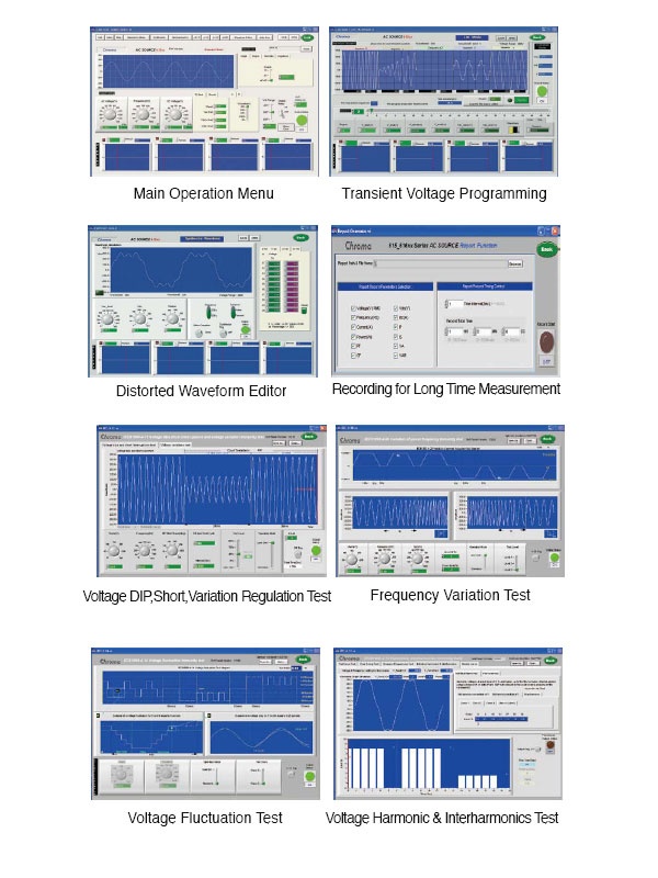 Chroma61504可編程交流電源提供圖形化接口的控制軟件, 提供簡易設定及操作, 可執行所有的功能. 并內建測試法規. 并可以長時間記錄量測值, 存成檔案供分析。