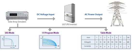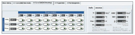 于此Softpanel內建一Sandia及EN50530的Photovoltaic I-V Curve Model,此可方便使用者只需輸入欲測試PV Inverter的輸入功率值(Pmax)、 Fill Factor、Vmin、Vnom及Vmax值,然后使用者可直接按要測試的功率百分比值(5%、10%、20%、25%、30%、50%、75%、99.9%),此Softpanel可自動地產生此測試的太陽電池I-V曲線,接著直接按下載至單機后開始模擬此I-V曲線予PV Inverter測試Conversion Efficiency。