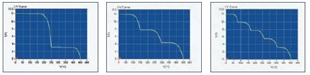 另外實際太陽電池(Solar Array)陣列會因天候如 照度、溫度、云遮或下雨而影響輸出I-V曲線,Chroma62150H-1000S單機可讓使用者儲存100條I-V曲線,且可設定每條曲線欲執行輸出時間,此可讓使用者測試光伏逆變器于不同地區下天候條件的長時間功率追蹤效能。