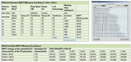 因動態功率點追蹤效能也會影響逆變器對光伏發電系統所發電能的有效利用及長期效益,因此法規EN50530 & Sandia & CGC /GF004訂定一標準動態功率點跟蹤效能測試程序,此可讓逆變器設計廠家對于功率點追蹤演算效能得到一測試及提升。使用者可藉由SoftPanel內建EN50530 & Sandia & CGC/GF004的Dynamic MPPT測試程序選取欲測試項目,此可簡單地測試逆變器于研發及品保階段,當測試執行過程中可即時地計算Energy及MPPT EFF%,并且可將測試追蹤過程的讀值記錄下。