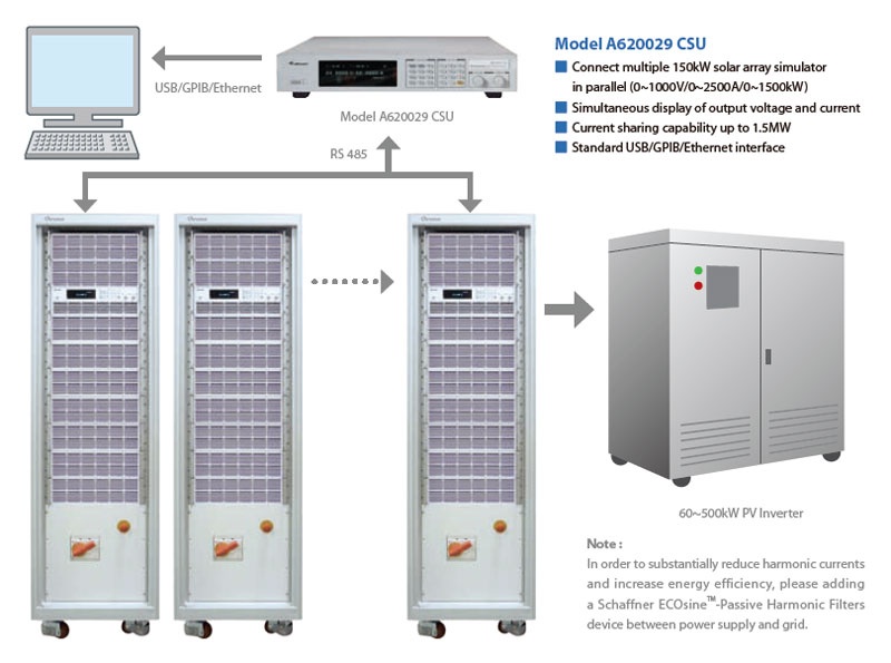 大功率太陽電池陣列模擬需求于商業用及發電站用光伏逆變器測試時,使用者可簡單地并聯方式連接二臺或多臺電源模組以達到1.5MW。 Chroma62150H-1000S電源供應器具有主/從并聯控制模 式達10臺150kW輸出,使并聯操作模式快速又簡易,在此模式中,使用者只需透過前面板或遠端數位控制主(Master unit)單機,系統會自動將設定數值下載資料到從屬(Slave unit)單機,具有高速同步訊號控制處理,且系統具有自動均流控制。