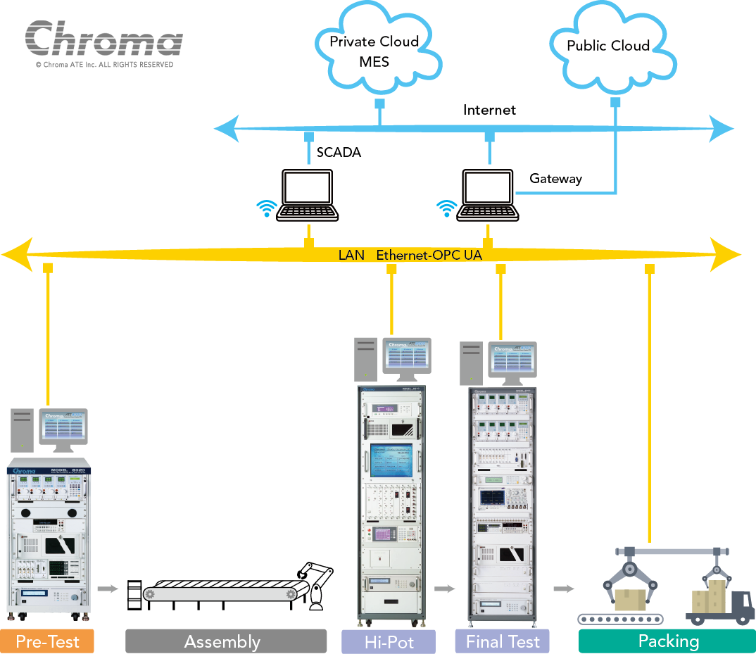 Chroma 8000自動測試系統適合現代化的大規模量產生產線,可搭配支援Chroma Sajet制造資訊系統(Manufacturing Execution System, MES)進行測試站別、人員、產品序號及測試程式的控制與管理,以及測試數據上傳中央伺服器功能,達到測試程式集中管理與數據資料搜集/報表分析等應用,協助客戶完成智能工廠之目標,提高產品品質、效能,降低生產成本,創造企業利益最大化。另Chroma可提供客制化Shop-Floor控制系統服務,連結客戶廠內既有MES,到目前為止已協助眾多海內外世界級制造大廠完成MES系統整合之實績案例。