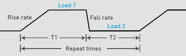 63200E系列內建255組可編程負載時序,供用戶模擬各種不同的真實拉載狀況。可單一時序(Sequence)負載重復拉載與全部時序負載重復拉載,每個時序的最小時間為100毫秒(ms),分辨率為100毫秒,以下舉例說明一般常見的編程時序應用。