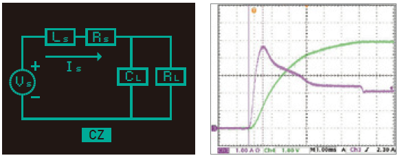 定阻抗拉載模式不同于定電流及定功率的拉載方式,定阻抗模式亦即仿真實際的感抗、阻抗、容抗與負載來進行拉載,因此,拉載電流更能趨近真實情況。此波形圖為模擬交換式電源供應器于容性負載開機測試的電壓、電流波形。