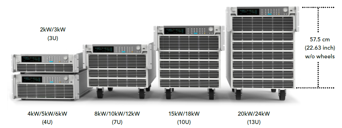 63200E系列共有5種高度、12種功率、3種電壓,共計36個型號。超高功率密度設計,顛覆高功率電子負載體積大、移動不便的觀念,能為實驗室節省不少空間,同時能輕松解決自動測試系統更新電子負載時的空間議題。