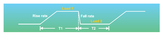 在快速的時代里,電子元件皆朝高速運作的方向設計,因此,電源元件對于暫態的信號及動態響應的性能要求,比過去都高出許多。為滿足這些 測試應用與要求,63200系列提供高速、可編程動態負載模擬與同步動態負載等功能。下圖所示為可編程的參數:設定電流高/低準位、T1/T2、爬 升率/下降率。可編程的電流爬升率/下降率可用來模擬真實負載情況的暫態負載變化模擬。63200系列中,在負載電流連續變化時,內部的監測機 制與線路能使得電流波形失真度達到小化,電流爬升率快可達25A/μs (63208)、動態變化可高達20kHz。