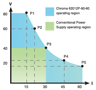 62000P系列直流電源供應(yīng)器提供寬廣的操作范圍。例如,62012P-80-60的輸出規(guī)格為 1200W/80V/60A可于不同的組合中靈活操作如圖右側(cè)所示。如普通的直流電源電源供應(yīng)器顯示提供所有的輸出電壓相同的額定電流,而62000P于低輸出電壓時(shí)提供較大的電流。這表示低電壓/高電流及高電壓/低電流兩者的待測物可使用單臺(tái)直流電源供應(yīng)器測試輸入穩(wěn)定度,于一般的ATE系統(tǒng)內(nèi)部避免多臺(tái)直流電源供應(yīng)器以節(jié)省成本與空間。