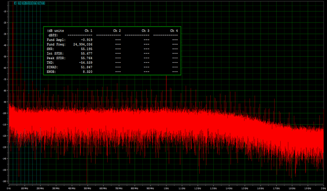 當高速ADC進行數據采集時,由于噪聲和失真的影響,實際ADC的信噪失真比達不到其標稱位數應達到的理想性能。一般情況下,示波器帶寬越高,其內部噪聲就越高。因為高頻噪聲會進入高帶寬示波器內。由于ADC僅為示波器系統的一部分,不能獨立使用,因此整個示波器系統的ENOB指標會更有意義。SDS3000X HD高達8.3~8.6-bit,時間誤差、頻率雜散都比較小,同時寬帶噪聲也比較低,能夠有效保證測量的精準度。