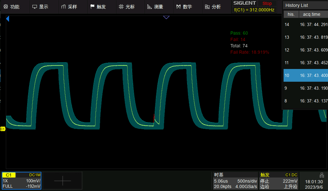 模板測試功能主要用于信號質量的評估,能夠長時間監控波形的故障率,并根據故障波形定位原因。有兩種規則設置方式,一是通過在示波器中繪制多邊形模板創建規則,二是根據“完美波形”設置水平和垂直數值創建規則,而后示波器對波形進行實時測試,可統計在規定的測試條件內測試的次數、失敗的次數、失敗率等,還能夠設置“存儲失敗幀”,失敗波形可通過歷史模式進行查看。