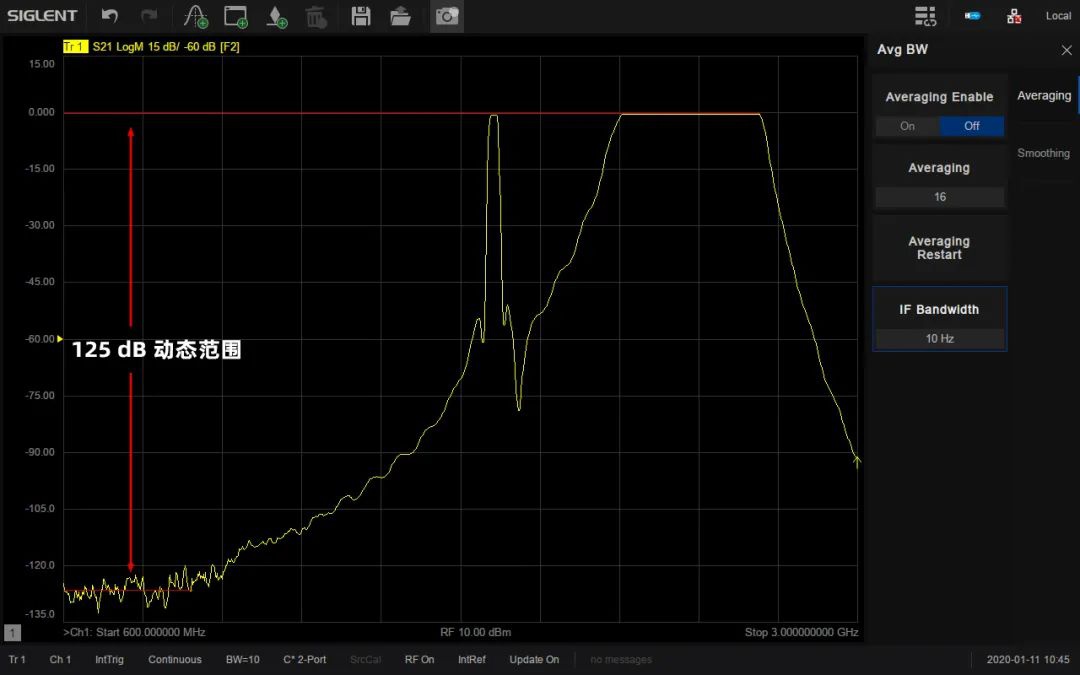 系統動態范圍是VNA一個非常重要的指標,它是VNA源的最大輸出功率與測試端口本底噪聲的差值。SNA5000A擁有最大125 dB的動態范圍,可適用于對動態范圍要求比較高的測試場景,比如同時測量濾波器的通帶和帶外抑制性能。