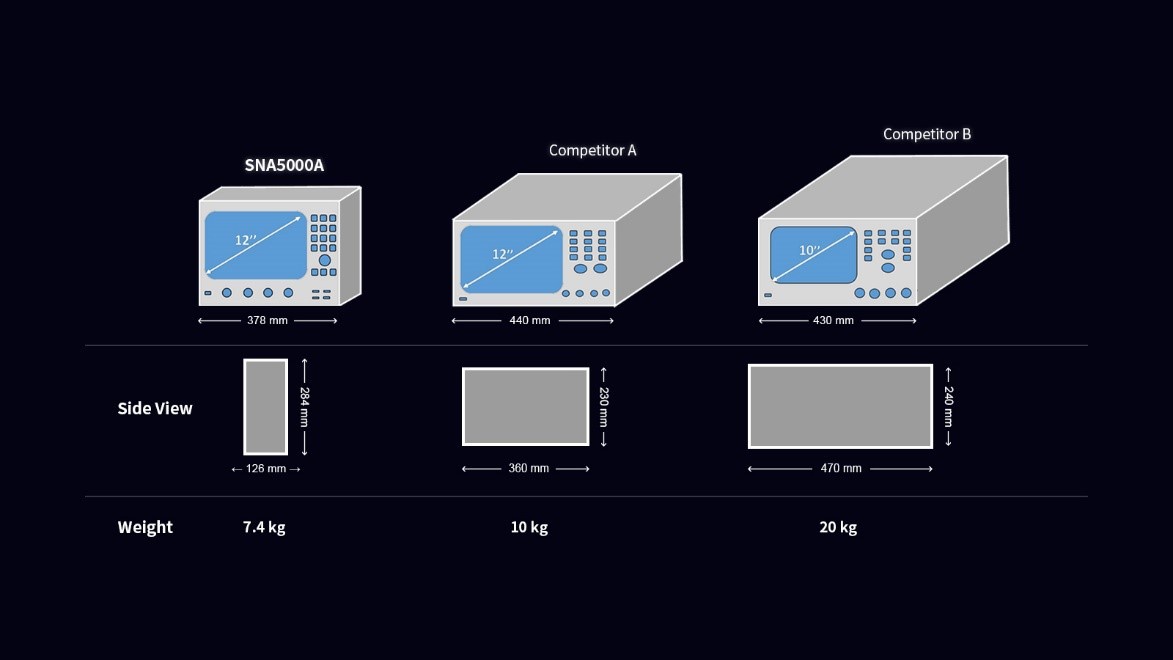 不管是在研發還是在現代化的生產線,區別于傳統笨重的矢量網絡分析儀,SNA5000A超前的外觀設計都能為工程師或者產線節省大量的桌面空間。