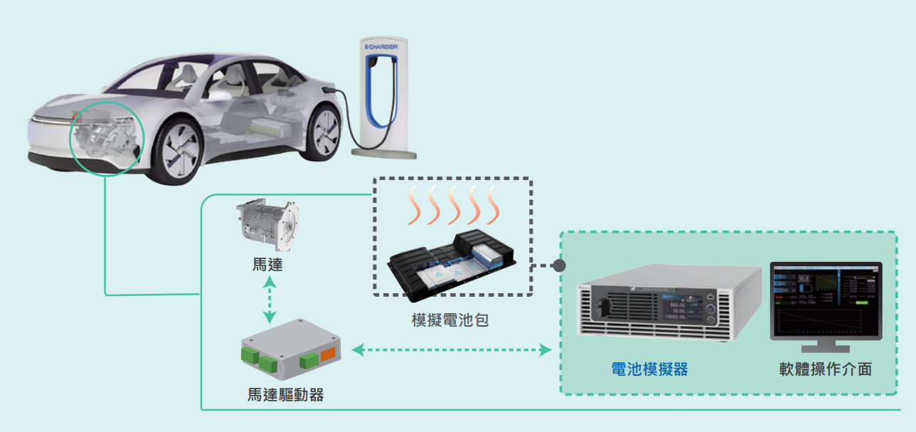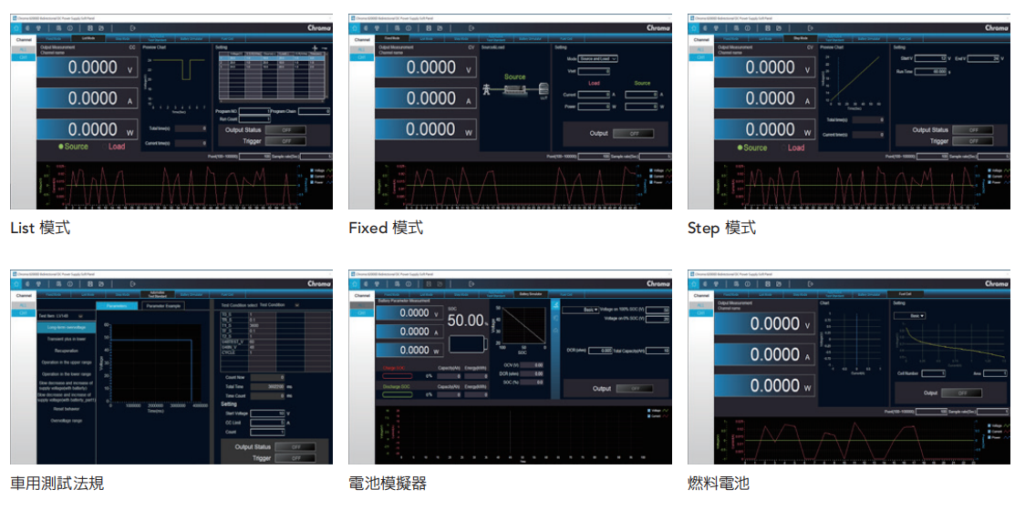 62000D系列雙向電源設(shè)計(jì)可搭配電池模擬軟件(Battery Simulator SoftPanel)成為一電池模擬器,具有可模擬操作于不同電池電量(SOC)條件或加載特定的電池特性V-I曲線,進(jìn)行評價(jià)測試待測物(電力轉(zhuǎn)換裝置)做充電或放電的電池模擬使用,適用于車載充電器、儲能裝置或馬達(dá)驅(qū)動器等產(chǎn)品測試。