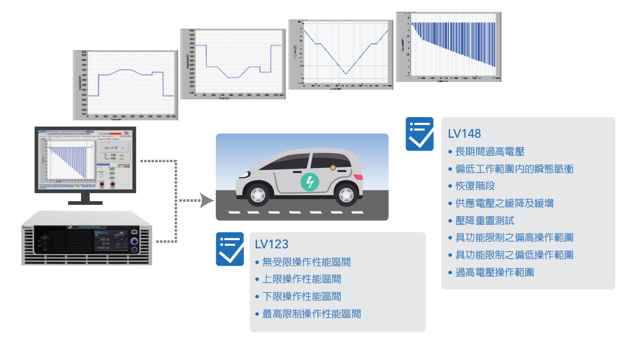 因應(yīng)全球節(jié)約能源之趨勢以及降低碳排放的走向,各車廠也紛紛發(fā)表未來世代新能源汽車的技術(shù)發(fā)展及標(biāo)準(zhǔn)規(guī)范,定義各種類型的電動車輛測試,其中LV123所標(biāo)定之車內(nèi)高壓系統(tǒng)之部件測試,以及LV148所標(biāo)定之48V電池電壓系統(tǒng)之部件測試。62000D雙向直流電源具有高速CV動態(tài)響應(yīng)斜率可控制最高達(dá)180V/ms,此可應(yīng)用于許多汽車法規(guī)之電器特性測試,搭配Chroma Softpanel軟件,使用者更可一鍵操作輸出測試。