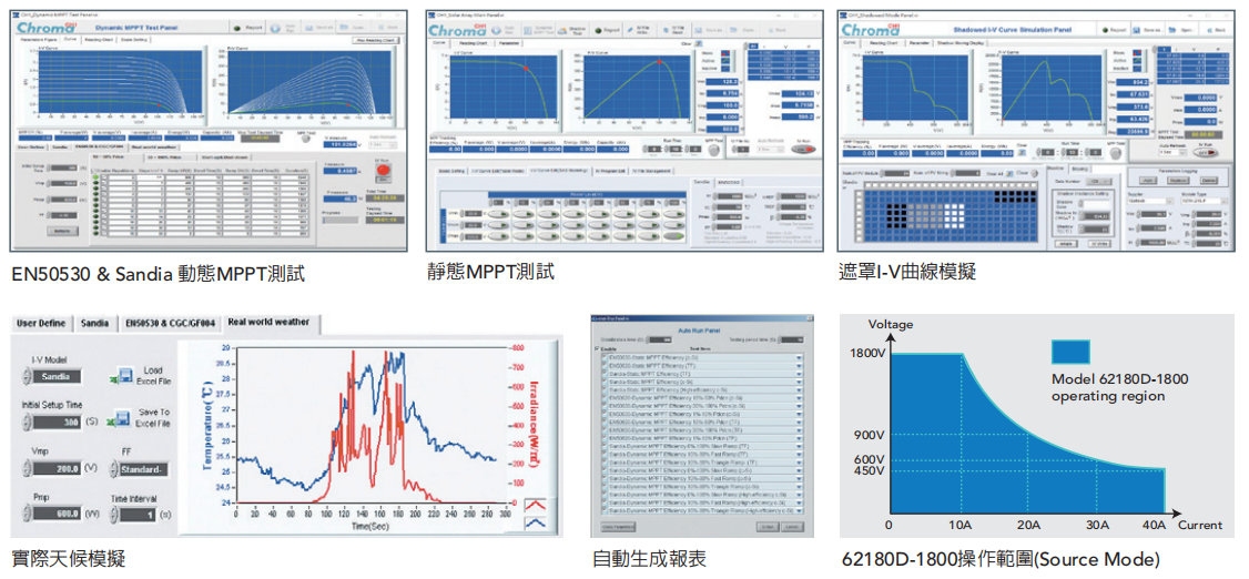 62180D-1800機(jī)型具選配太陽電池?cái)?shù)組模擬功能,于單機(jī)內(nèi)置EN50530 & Sandia的SAS模型方便使用者透過前面板操作或遠(yuǎn)端控制整合使用,軟體具有靜態(tài)及動態(tài)最大功率點(diǎn)追蹤(MPPT)測試、掩碼I-V曲線模擬、實(shí)際天候的I-V曲線變化測試、自動程序靜態(tài)&動態(tài)MPPT性能測試及自動生成報(bào)表于Excel表格內(nèi),以上非常適合驗(yàn)證組串式光伏逆變器性能。另外,62180D-1800(1800V/40A/18kW)機(jī)種可支持主/從并聯(lián)30臺,輸出規(guī)格達(dá)540kW/ 1800V/ 1200A以調(diào)節(jié)于高壓1500V商業(yè)(15-100kW)組串式逆變器及分布式發(fā)電站用(150-500kW)逆變器測試使用。