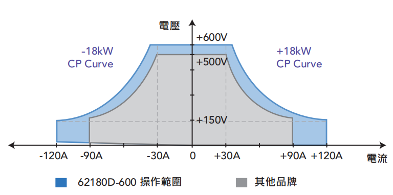 62000D雙向直流電源提供寬廣的4倍操作范圍。型號62180D-600的輸出規(guī)格為18kW/600V/120A可于不同的組合中靈活操作如圖所示。相較競爭者直流電源的輸出范圍為3倍,62000D于低電壓時(shí)提供較大的電流。這表示低電壓/高電流及高電壓/低電流兩者的待測物可使用此單臺直流電源供應(yīng)器測試涵蓋更廣,于一般的ATE系統(tǒng)及實(shí)驗(yàn)桌使用時(shí)可取代多臺直流電源供應(yīng)器以節(jié)省成本與空間。
