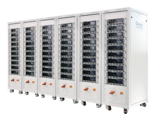 儲能變流器(PCS)為連接于電池系統(tǒng)與電網(wǎng)之間可實(shí)現(xiàn)電能雙向轉(zhuǎn)換的裝置,其直流端電池電壓范圍從450V~1500V高壓趨勢發(fā)展,此裝置具有充放電功能、有功功率控制、無功功率調(diào)節(jié)和并離網(wǎng)切換。使用者常困擾如何準(zhǔn)備實(shí)際高壓電池測試此PCS于充放電轉(zhuǎn)態(tài)(規(guī)格一般<100ms)性能,且無法快速可重覆性、控制性、安全性使用研發(fā)驗(yàn)證及生產(chǎn),62000D具有高壓62180D-1800(1800V/40A/18kW)機(jī)種可并聯(lián)達(dá)540kW/1800V/1200A,以取代真實(shí)電池模擬為一臺電源或一臺能源回饋負(fù)載進(jìn)行此充放電轉(zhuǎn)態(tài)性能于連續(xù)電流不中斷。