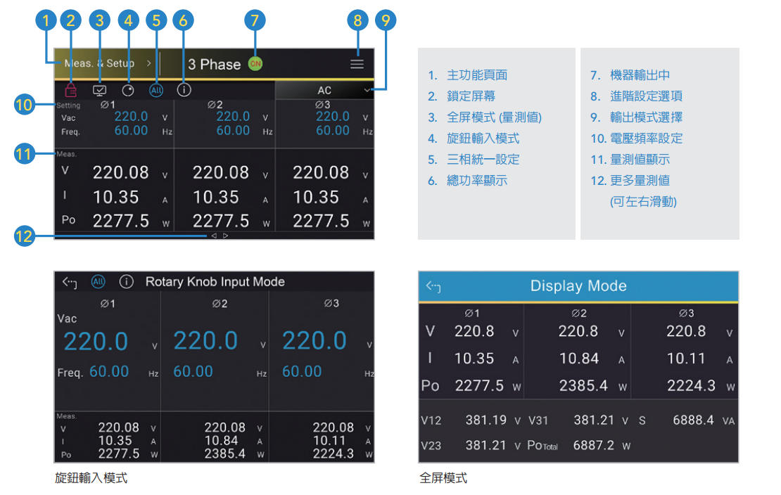 Chroma 61809/61812/61815機(jī)種配備觸控式操作屏幕,提供直觀的UI界面讓使用者快速進(jìn)行多項設(shè)定和操作。其中的旋鈕輸入模式可針對欲設(shè)定的參數(shù)做放大顯示,適用于需要微調(diào)參數(shù)的測試應(yīng)用;全屏模式則可將所有測量值擴(kuò)展至全屏,適用于完成輸入設(shè)定后的觀察環(huán)節(jié),提供使用者更清楚的測量參數(shù)畫面。