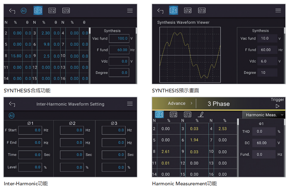 SYNTHESIS(合成)功能提供以50Hz或60Hz為基本頻率來設(shè)定50階的諧波成份,形成周期性的失真波形;Inter-Harmonic功能可在基頻之外,設(shè)定另一個非諧波的變動頻率成份,頻率范圍能從0.01Hz掃描到3000Hz,可借此幫助發(fā)現(xiàn)待測物輸入端的諧振點或抗干擾的脆弱點;Harmonic Measurement功能可針對電壓或電流做50階的諧波測量,并顯示基波電壓、直流成分、以及總諧波失真度等數(shù)值。