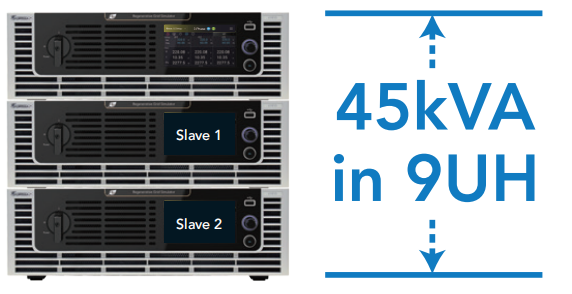 61809/61812/61815具備主從機(jī)(Master-Slave)并聯(lián)輸出功能,能以總并聯(lián)臺數(shù)最多三臺來滿足更高的輸出功率需求。使用者可藉由連接三臺61815回收式電網(wǎng)模擬電源,以一臺主機(jī)加二臺從機(jī)的并聯(lián)構(gòu)架,實現(xiàn)9U硬件高度內(nèi)含總輸出功率45kVA的高功率密度配置。