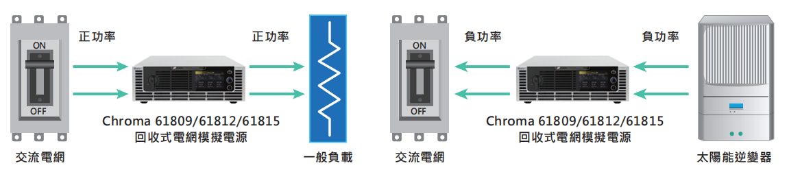 Chroma 61809/61812/61815機(jī)種具備能源回收功能,可提供使用者完善的節(jié)能方案。待測物在測試中所產(chǎn)生的能量,經(jīng)由機(jī)器可高效率回饋到電網(wǎng),而不是在測試過程以熱能消耗,達(dá)成環(huán)保節(jié)能的目的。借此,61809/61812/61815可適用于市面上各項綠能相關(guān)產(chǎn)業(yè)測試,如太陽能逆變器、儲能系統(tǒng)(ESS)、電力調(diào)節(jié)系統(tǒng)(PCS)、微電網(wǎng)(Micro grid)、電力相關(guān)硬件回路模擬(PHIL)、電動車電源設(shè)備(EVSE)、車載充電器(OBC)及雙向車載充電器(BOBC)等等。