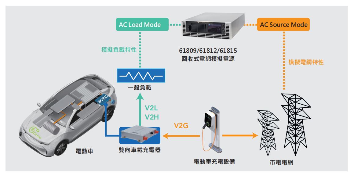 Chroma 61809/61812/61815機(jī)種可對電動汽車產(chǎn)業(yè)相關(guān)產(chǎn)品,如電動車充電設(shè)備EVSE(Electric Vehicle Supply Equipment)及車載充電器OBC(On Board Charger)等提供完善的電源測試解決方案,亦可完成EVSE測試規(guī)范SAE J1772(AC Level 1,AC Level 2)、OBC中國QC/T 895標(biāo)準(zhǔn)等法規(guī)測試。此外,OBC的發(fā)展趨勢正朝著雙向充放電應(yīng)用如V2G(Vehicle to Grid)、V2L(Vehicle to Load)及V2H(Vehicle to Home)等技術(shù)做發(fā)展,而61809/61812/61815具備能源回收功能、AC Load選配功能、PLD進(jìn)階編輯功能,可滿足此雙向車載充電器BOBC(Bi-directional OBC)相關(guān)的各項測試應(yīng)用需求。