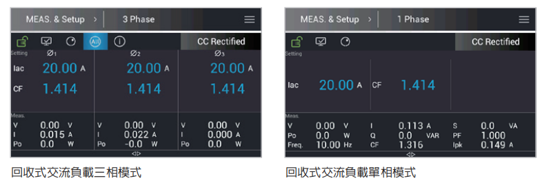 Chroma 61809/61812/61815機(jī)種可選配B618007:回收式交流負(fù)載功能,實現(xiàn)單一機(jī)體擁有交流電源和交流負(fù)載雙功能,使用者可透過簡易的UI操作快速切換Source或Load模式。當(dāng)機(jī)器為交流負(fù)載模式時,不僅具備能源回收功能,可進(jìn)行四象限拉載,且單機(jī)可選擇單相或三相操作模式,此外也支持最多三臺單機(jī)并聯(lián)功能,提供最高45kW的交流負(fù)載測試方案。