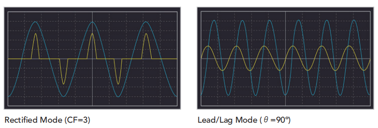Chroma 61809/61812/61815回收式交流負(fù)載具備定電流、定功率、定阻抗等基本功能。其中定電流和定功率功能,依附加設(shè)定參數(shù)為峰值因素CF,或電壓/電流相位差θ,分別提供Rectified Mode、Lead/Lag Mode等操作模式。Rectified Mode可模擬整流性負(fù)載特性,設(shè)定峰值因素CF為1.414~3,實現(xiàn)非正弦波的電流波形拉載。Lead/Lag Mode可模擬電容性或電感性負(fù)載特性,設(shè)定拉載電流超前或落后電壓0°~90°。此交流負(fù)載功能主要應(yīng)用于EVSE充電站、混合式逆變器、不斷電系統(tǒng)UPS、雙向車載充電器BOBC等待測物相關(guān)測試。