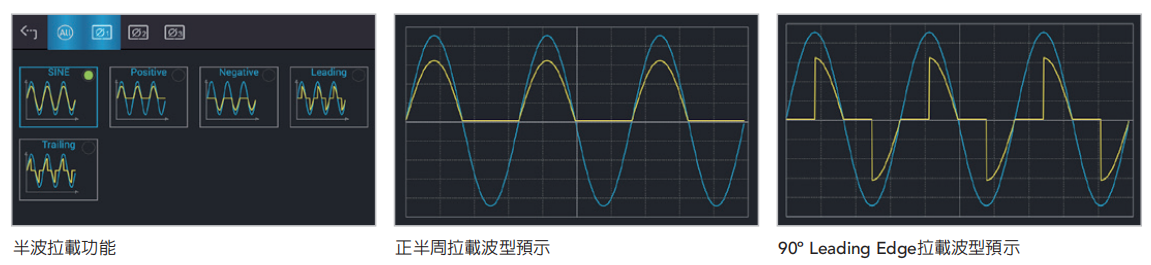 Chroma 61809/61812/61815回收式交流負(fù)載,于CC Rectified Mode提供半波拉載功能。在電壓、電流為正弦波條件下,可提供正半周、負(fù)半周拉載,以及模擬SCR/TRIAC開關(guān)特性的90度Leading Edge、Trailing edge半波拉載。使用者可藉由拉載半波電流,模擬調(diào)溫/調(diào)光的家用電器、保護(hù)開關(guān)、感應(yīng)馬達(dá)等相關(guān)待測物的負(fù)載特性,測試電壓源的輸出穩(wěn)定度。