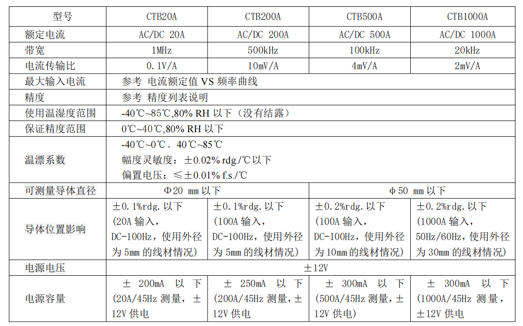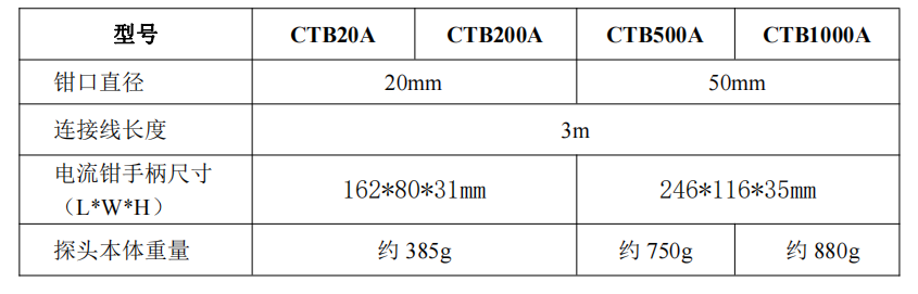 1 鉗口:CTB20A/CTB200A 直徑 20mm;CTB500A/CTB1000A 直徑 50mm。