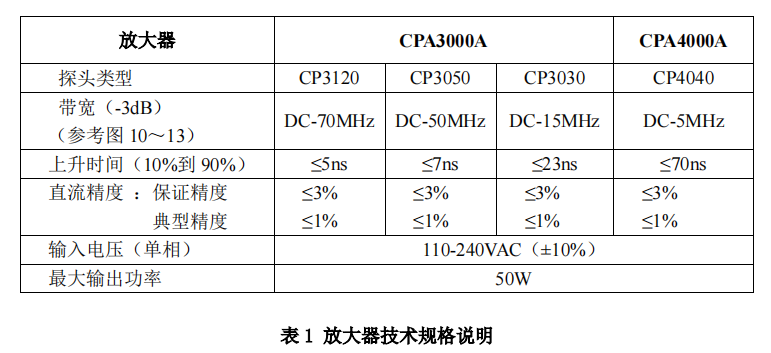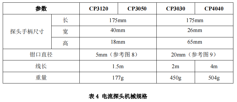 CP3030 鉗口可夾住直徑達 20mm 的導線,適用于大電流應用場合;可以測量 150A 的連續電流和 300A的峰值電流,提供了 15MHz 的帶寬;分辨率高達 5mA;需配合 CPA3000A 放大器同時使用。