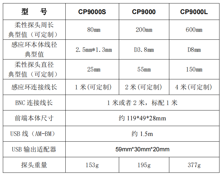 CP9000(S/L)系列柔性電流探頭是僅測試 AC 電流信號的探頭,具有高帶寬,高精度(典型值2%)等特點。可以實現寬廣的電流測量范圍,頻率可從幾 Hz 到數十 MHz,電流范圍從 mA 級別到數 kA級別,大大解決了電流測試的難題。其主要特點包括:線圈輕巧柔軟且可以自由插拔,可以探測到許多硬制探頭無法達到的地方,輕而易舉的實現與被測對象連接;插入損耗幾乎為零,僅為幾個皮亨,對被測對象近乎為零的干擾;標準的 BNC 輸出接口,很方便實現與示波器,數據采集器,數字電壓表等連接,觀測電流波形;USB 供電接口設計,使用更加靈活方便;聲光過流報警功能,更具人性化設計;探頭環和連接線長度可以根據客戶要求定制,滿足特殊場合測試要求。