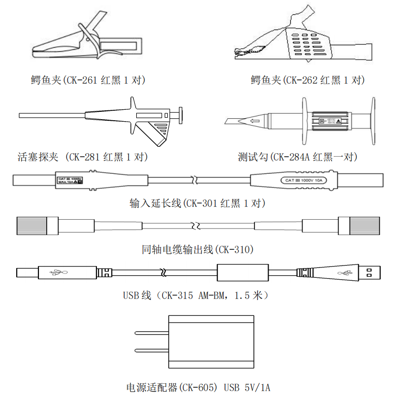 輸入線:長度約 26cm,連接探夾后測量電壓信號,也可以連接延長線(約 1 米)增加輸入線長度,使用延長線時,要求被測信號頻率在 5MHz 以下。