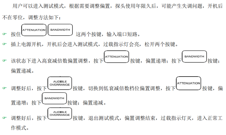 出廠設(shè)置:出廠設(shè)置默認為高衰減倍數(shù)檔位、選擇 FULL 帶寬、打開聲音報警功能。產(chǎn)品具有自動記憶功能,自動保存關(guān)機前狀態(tài)。