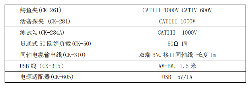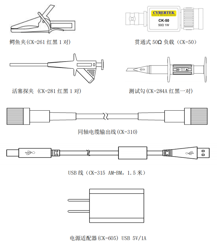 ④電源接口:標準的 USB B 型接口,通過標配的 USB 適配器供電;也可以通過示波器供電,使用方便。