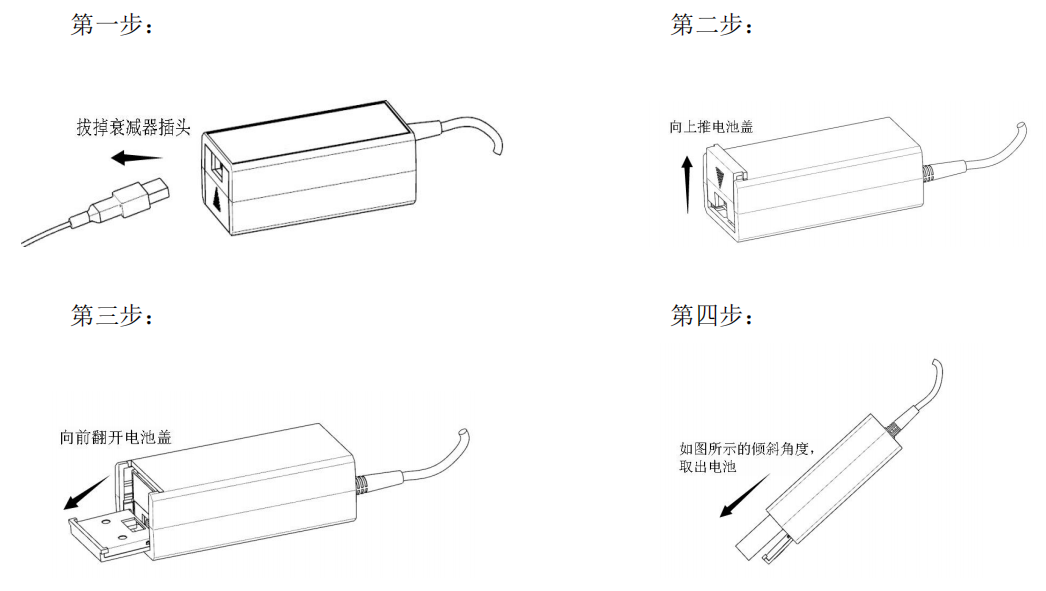產品標配 7.4V/950mAh 兩塊鋰電池,如上圖所示:電池安裝位置,本設計在插入衰減器后,衰減器起到限位作用,電池無法取出,如需取出電池充電,參考如下步驟: