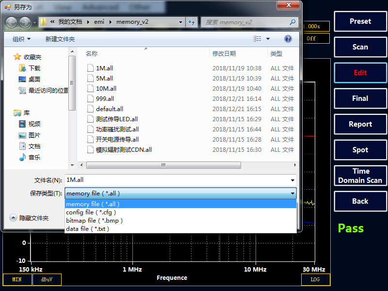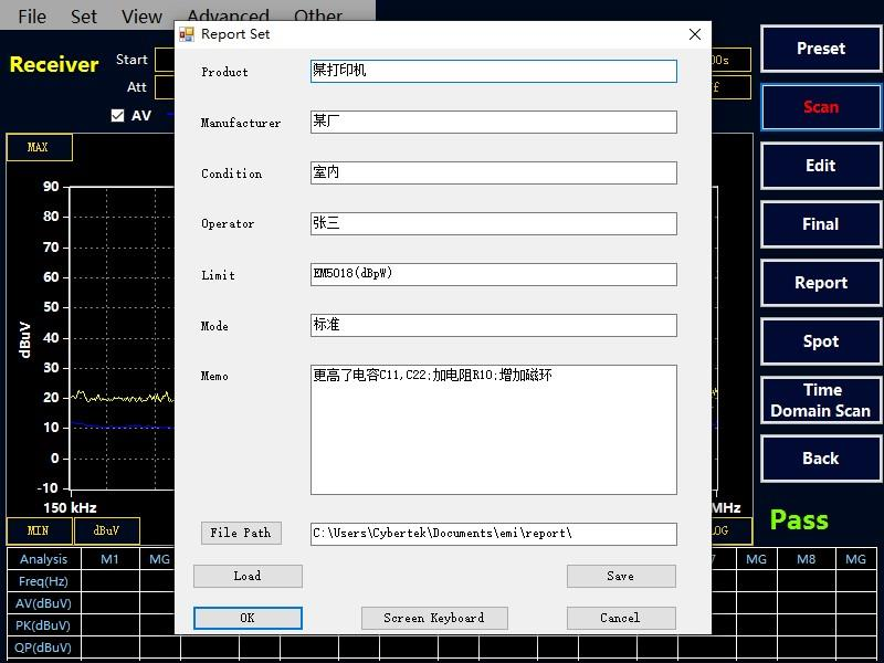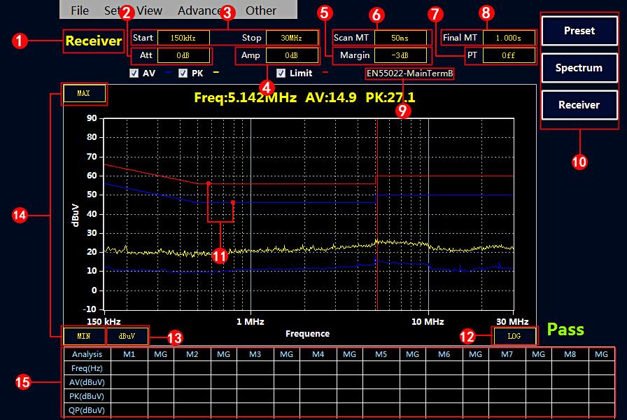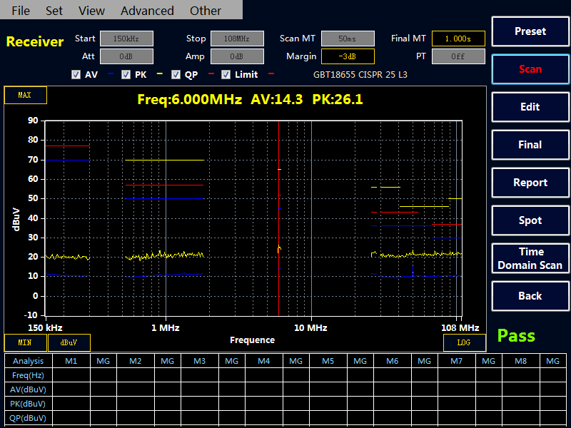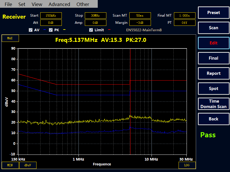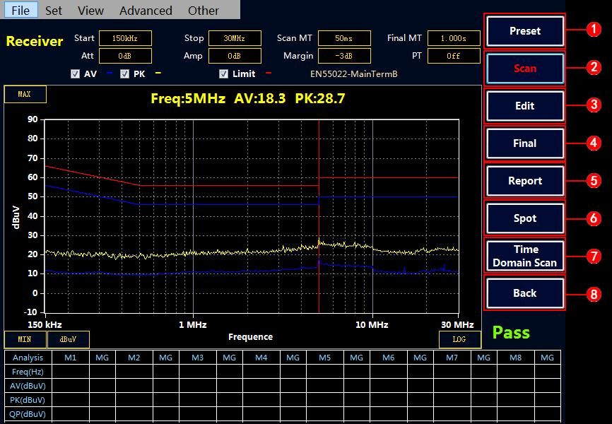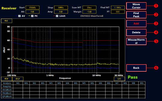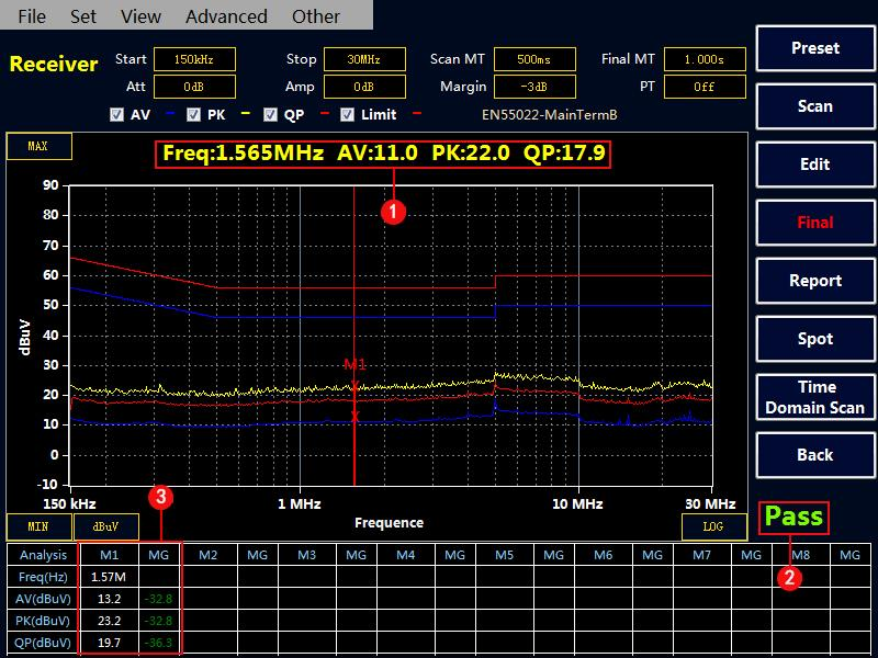選擇“Final” 按鍵,接收機會對表格中的點進行終測,測量 PK,AV,QP 值,測量時間在Final MT 中設置。如果沒有超標點或者手動添加的測試點,Final 終測是無效的。注意:終測時請不要關閉被測設備。