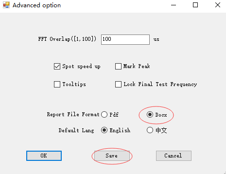 選擇“Make Report”,會自動生成 PDF 形式的報告。可以保存到主機或者通過 USB 接口存儲到 U 盤中。也可點擊接收機模式下的主菜單中的快捷鍵“Report”直接生成報告。另外也可以生成 word 版的報告(前提是主機需要安裝 WPS 或者word),點擊 Advanced——Advancedoption 中報告文件格式選擇 Docx,點擊 Save 后,下次開機啟動自動生成 word 版測試報告。