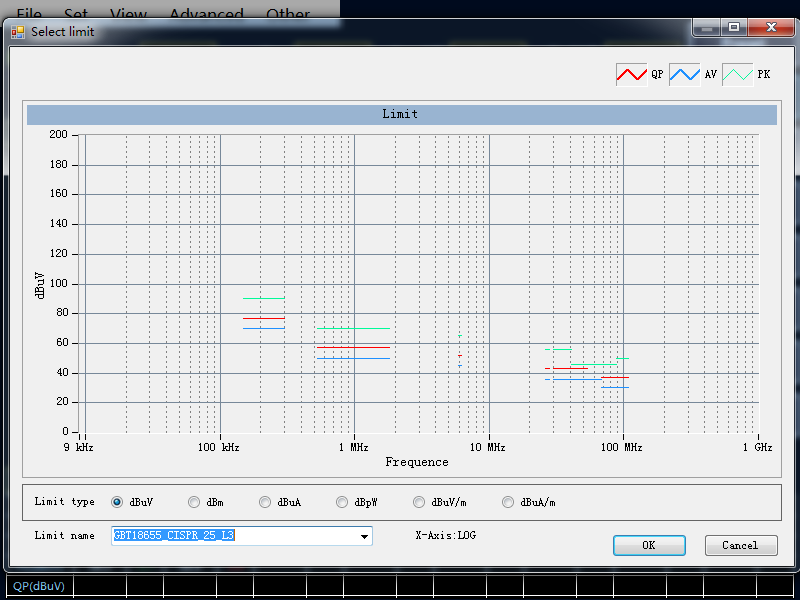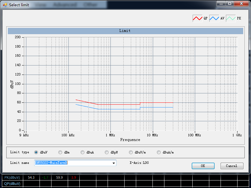 Limit Name 填入標準名稱“EN55022”,單位選擇 dBuV,X 軸選擇 log。