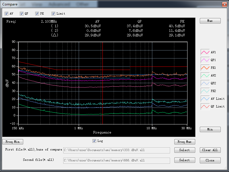 在菜單欄中點擊 Advanced——Advanced option,將 Lock Final Test Frequency 選項勾上,點擊OK,回到主界面的超標點的頻率那一欄顯示紅色,說明設置成功,然后添加自己需要的測試頻點。(在接收機掃描到 PK 值和 AV 值后,如果客戶需要一直關注的峰值點的頻率對應的 PK,AV,QP 值,可以鎖定頻率點,在下次終測時,可以固定掃描自己需要的頻點。)