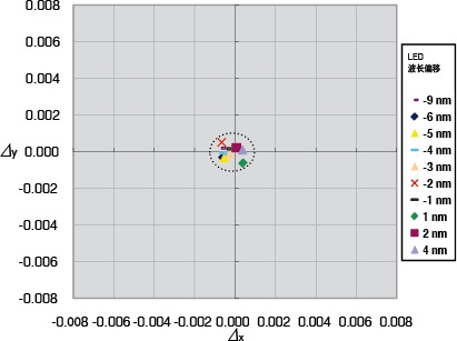 即使同一批次的LED背光的發光輻射曲線,也會經常有所不同,在其波峰處約有10nm左右的偏移現象。如果使用傳統的色彩分析儀來測量調整這種特性屏幕的白平衡,在xy色度上引起的誤差可能要接近0.010左右。但如果使用CA-310,同樣條件下的色度誤差會減小到0.003左右,約為原來的1/3,大大提高了測量精度和穩定性。