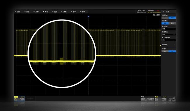 根據(jù)奈奎斯特采樣定律,為了保證采樣后的數(shù)字信號能完整復(fù)原真實信號的信息,一般實際應(yīng)用中需要保證采樣率為信號最高頻率的2.56~4倍。SDS7000A系列示波器的采樣率最高達20 GSa/s,是最高帶寬的5倍,能完美避免因采樣率不足而導(dǎo)致的信號失真。再搭配上最大1 Gpts/通道的長存儲深度,在長時間捕獲波形的同時,依然能使用更高的采樣率高保真捕獲波形,充分發(fā)揮4GHz帶寬性能。