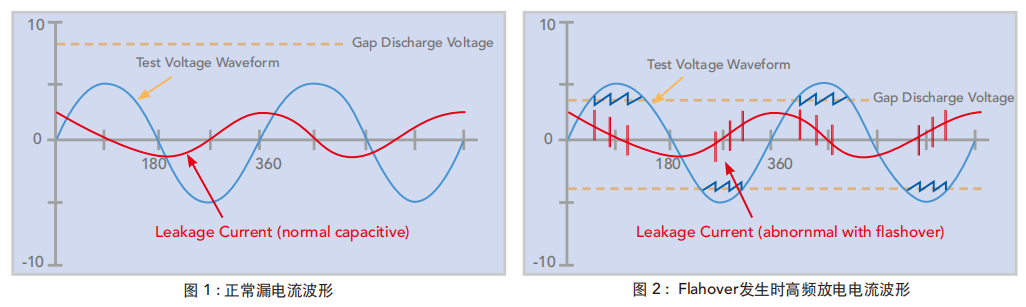 19070及19050系列與Chroma其它安規測試系列儀器同樣具有電氣閃絡偵測功能。電氣閃絡是絕緣材料內部或表面因高電界產生電氣放電,待測物失去原有之絕緣特性,形成瞬時或非連續性放電,導致碳化導電渠道產生或產品傷害。若只以漏電流判定則無法檢出不良,因此Flashover偵測為高壓測試不可或缺的檢視項目之一。