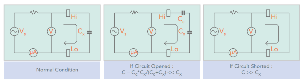 OSC功能為偵測測試過程中是否有開路(接觸不良)或短路(待測物短路)的情形發生,測試過程中若發生開路現象,會導致不良品誤判為良品;若發生短路現象,可提早得知并篩選,減少對治具設備的傷害,節省測試成本。一般耐壓測試產品皆呈電容性(Cx),在正常狀態下可能在數十pF至數μF之間。一旦發生連接斷路則會在斷路界面形成微小電容量(圖2之Cc),一般低于10pF,而呈現整體電容量遠低于正常產品現象。而當待測物短路或接近短路時時則會呈現電容量遠高于正常現象。因此可利用電容量變化之上下限值判定出短路問題。