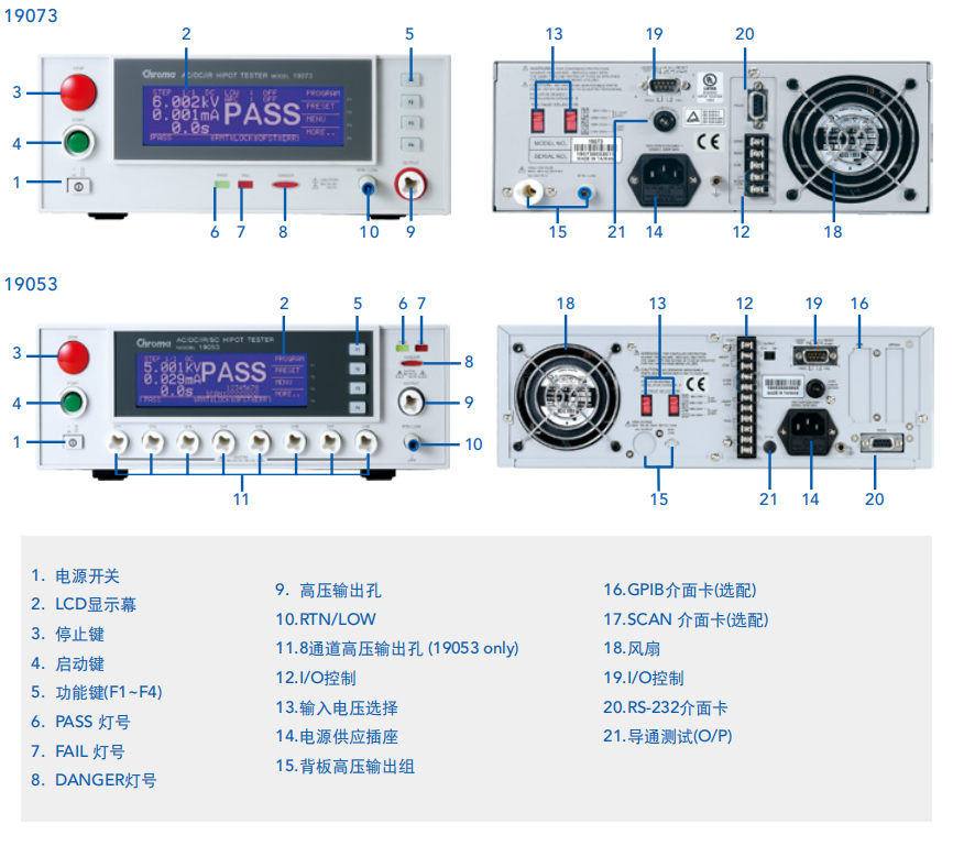 19050系列耐壓測試器有3個機種供選擇,19052ACV/DCV/IR耐壓測試器為單通道;19053ACV/DCV/IR耐壓測試器內置8信道高壓掃描功能;19054 ACV/DCV/IR耐壓測試則內置4信道高壓掃描功能。配有數位顯示面板與易于操作的界面,簡單執行耐壓與絕緣測試,為新型耐壓測試器。