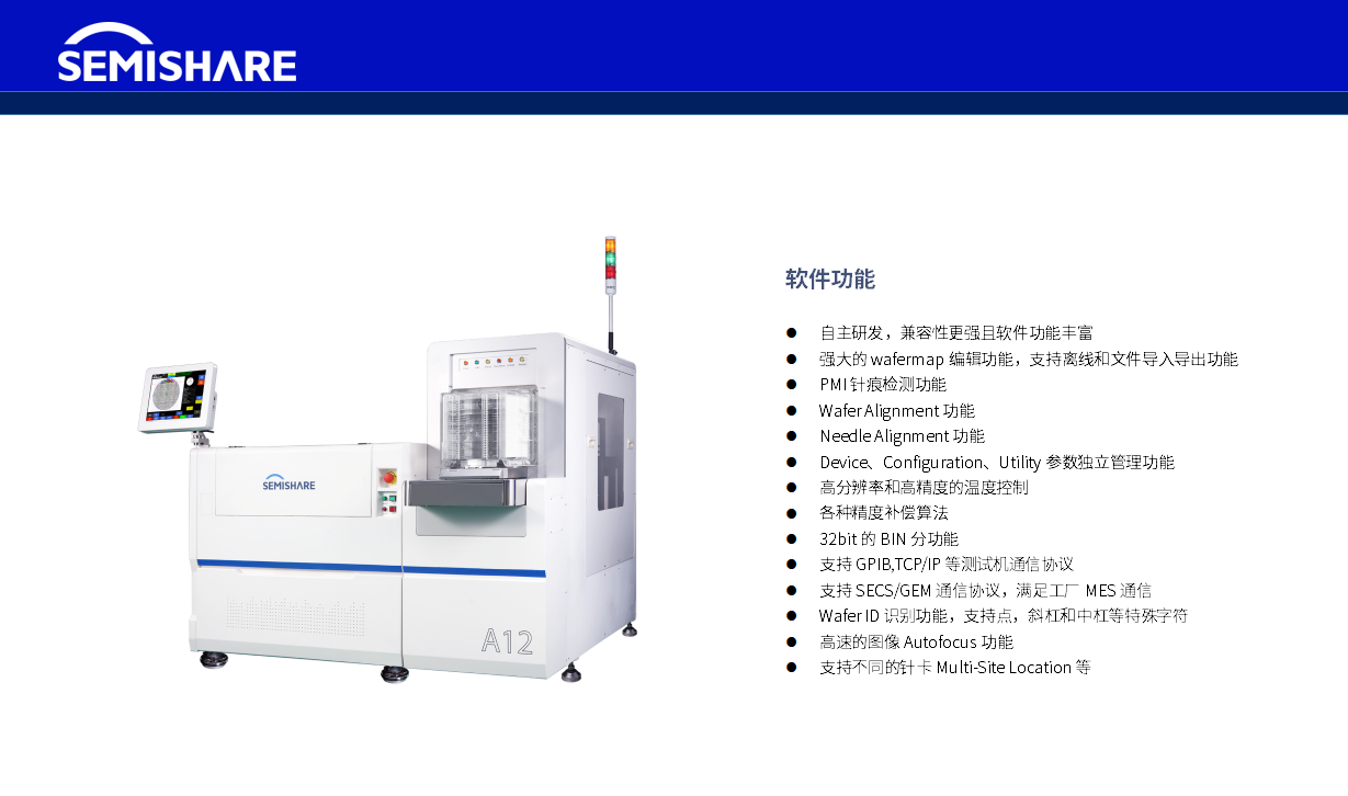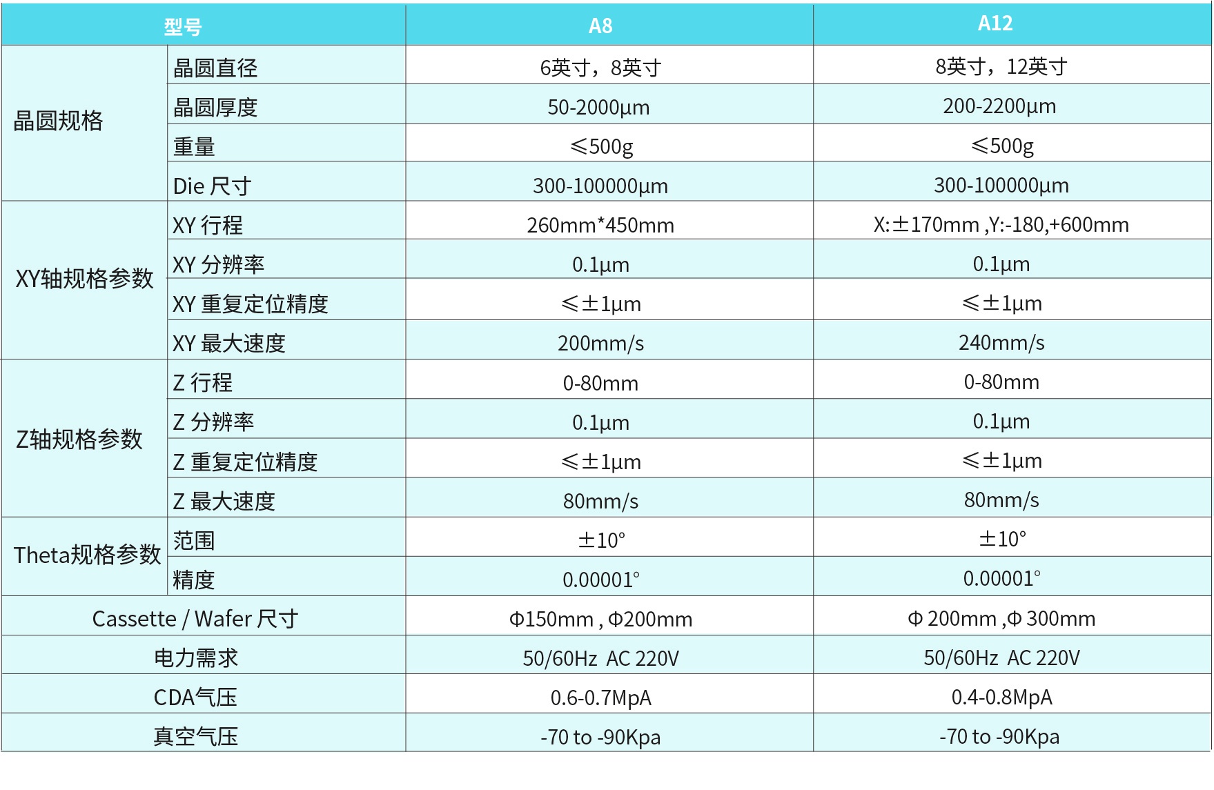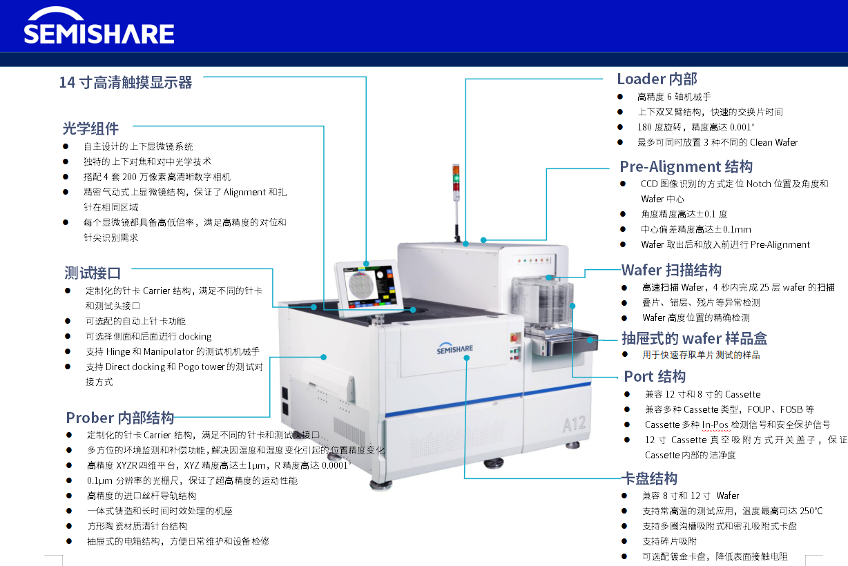 ●小尺寸輕重量,更小的占地面積 ●微米級全閉環運動控制 ●伯努利手臂支持薄片 ●高精度和測試速度,大大提高測試效率 ●24*7全天候在片探測 ●高壓大電流測試應用