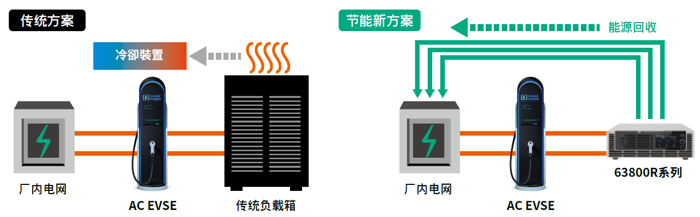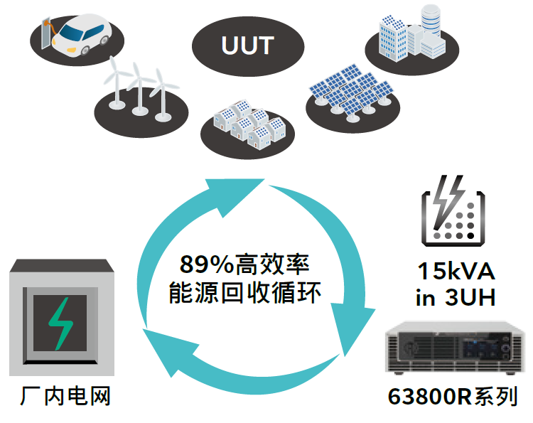 63800R系列可提供用戶完善的節能方案,透過其能源回收機制,被測物在拉載測試中所消耗的能量可高效率經由機器回饋到電網,而不是在測試過程以熱能消耗,達成環保節能的目的。借此,63800R系列可適用于市面上各項綠能相關產業測試,如儲能系統ESS、混合型太陽能逆變器(Hybrid PV Inverter)、電動車交流充電設備(AC EVSE),以及雙向車載充電器(BOBC)的V2L、V2H應用等。