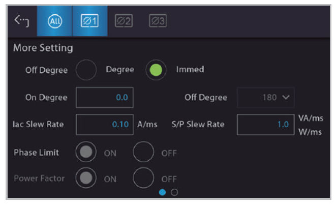 63800R系列能源回收式交流電子負載配備觸控式操作螢幕,提供直觀的UI介面讓用戶快速進行多項設定和操作。交流負載的進階功能如拉載/卸載角度、拉載電流Slew Rate等設定,皆隱藏于右上角More Setting功能,使主設定畫面簡潔干凈。而透過全屏模式,可將所有量測值擴展至全屏,適用于完成輸入設定后的觀察環節,提供用戶更清楚的量測參數畫面。