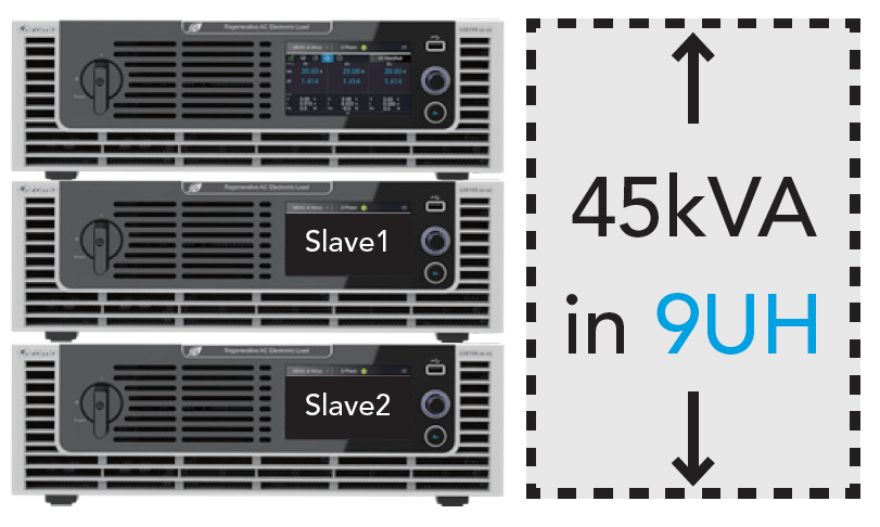 Chroma 63800R系列能源回收式交流電子負載具備主從機(Master-Slave)并聯功能,能以總并聯臺數最多三臺來滿足更高的拉載功率需求。用戶可藉由連接三臺同功率63800R系列產品,以一臺主機加二臺從機的并聯架構,實現9U硬體高度內含總拉載功率45kVA的高功率密度配置。